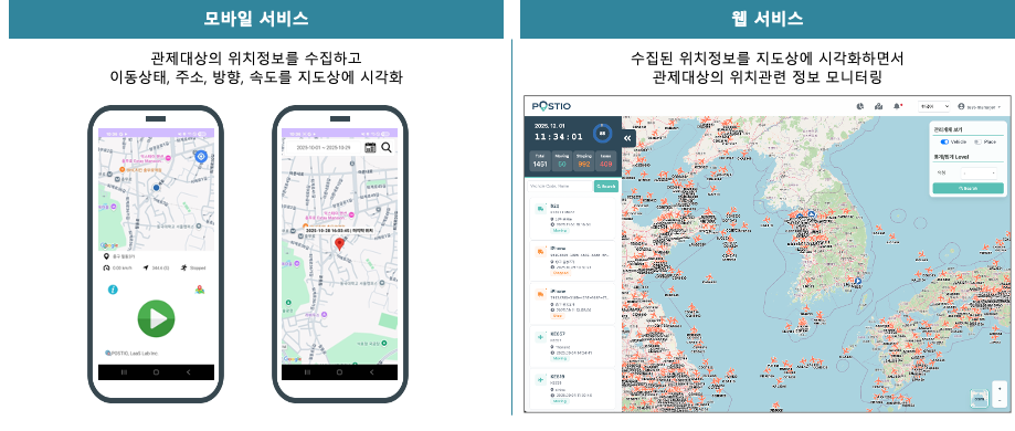 수집된 위치 정보를 지도기반 위치조회, 이동경로 관리, 특정 권역에 대한 In/Out 이벤트 예측/알람, 다중 경유지에 대한 경로를 생성하여 추천하는 위치관제 기능 제공
