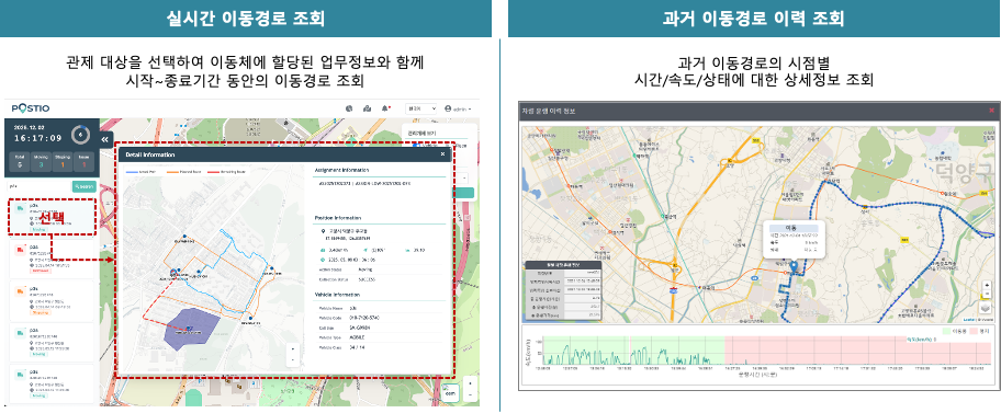 이동경로 관리 | 수집된 위치정보를 이력으로 관리하면서 관제대상의 이동경로와 함께 총 이동시간, 상태(이동, 정지) 평균속도 등 정보를 지도상에 시각화