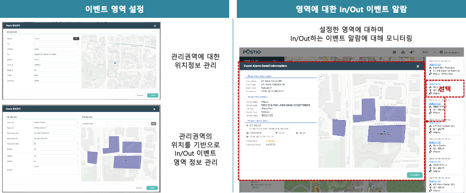 예측 및 알람 | 지오펜싱을 이용하여 관제대상이 특정 권역에 In/Out하는 이벤트를 통해 출발/도착하는 시간과 예상 소요시간과 같은 예측/알람 서비스 제공