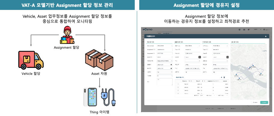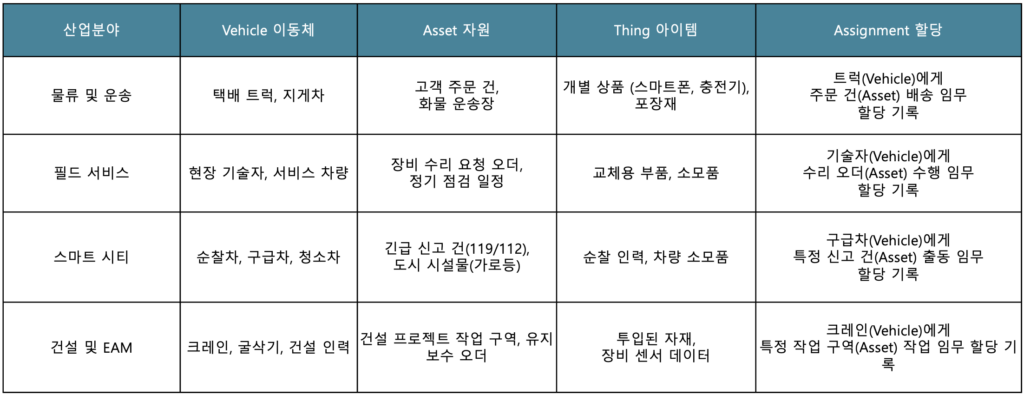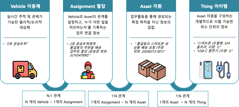 파편화된 Vehicle 이동체 의 실시간 위치 데이터, Asset 자산의 업무 상태, Thing 아이템의 재고 정보 등이 Assignment 할당을 통해 하나의 맥락 있는 데이터 모델로 통합되어, End-to-End 운영 가시성 및 효율적인 데이터 관리 기반을 마련