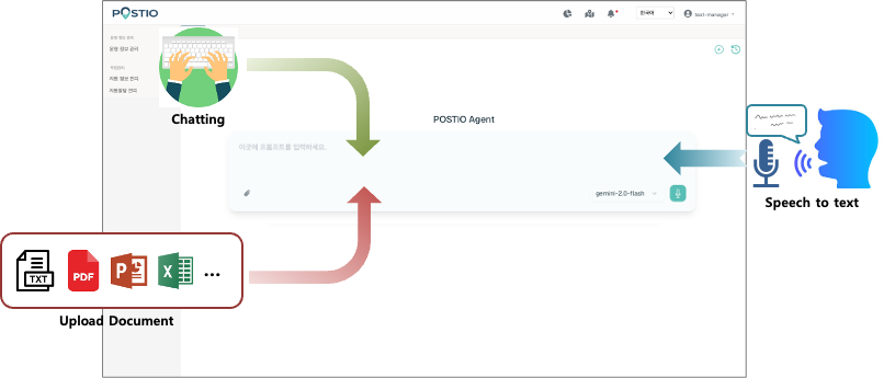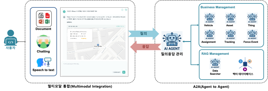사용자는 다양한 모달리티(문서, 텍스트, 음성 등)과 함께 질의를 하면 “질의응답 관리 AI Agent”는 A2A(Agent to Agent) 구조에서 관련된 AI Agent를 구동하여 질의에 대해 분석 및 업무를 처리하고 그 결과를 사용자에게 응답