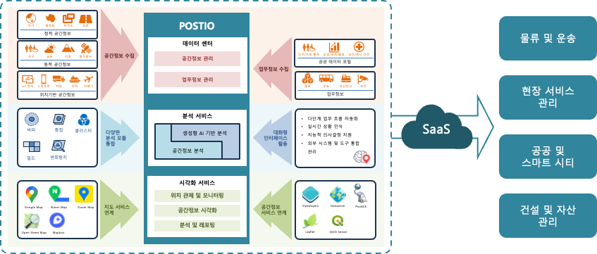 IT 및 GIS 전문 지식이 없는 사용자도 다양한 매체에서 수집된 위치/공간 정보와 업무 정보를 활용하여 지능적인 위치 관제 및 공간 분석 기능을 쉽고 편리하게 업무에 적용할 수 있도록 제공하는 Cloud SaaS형 서비스